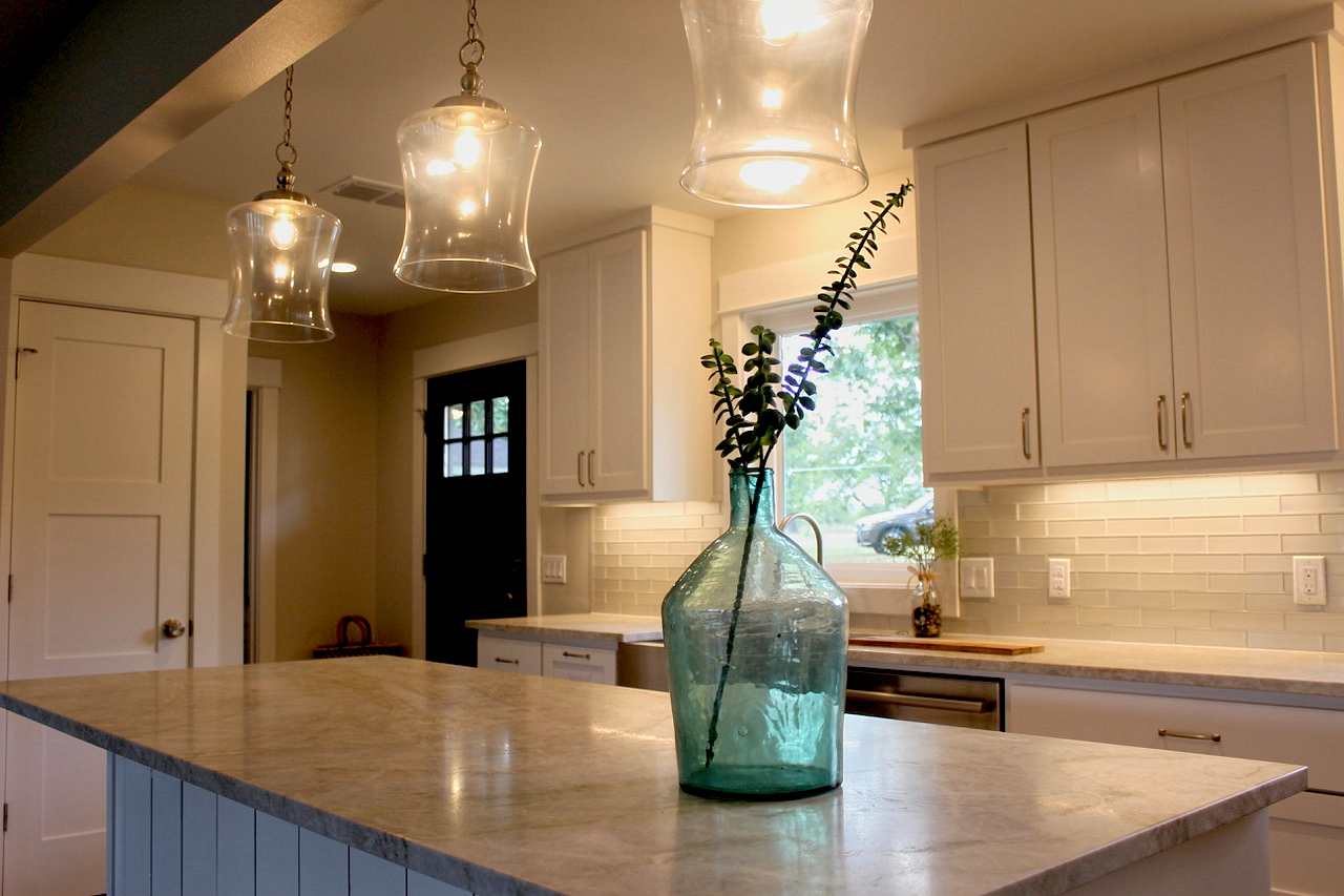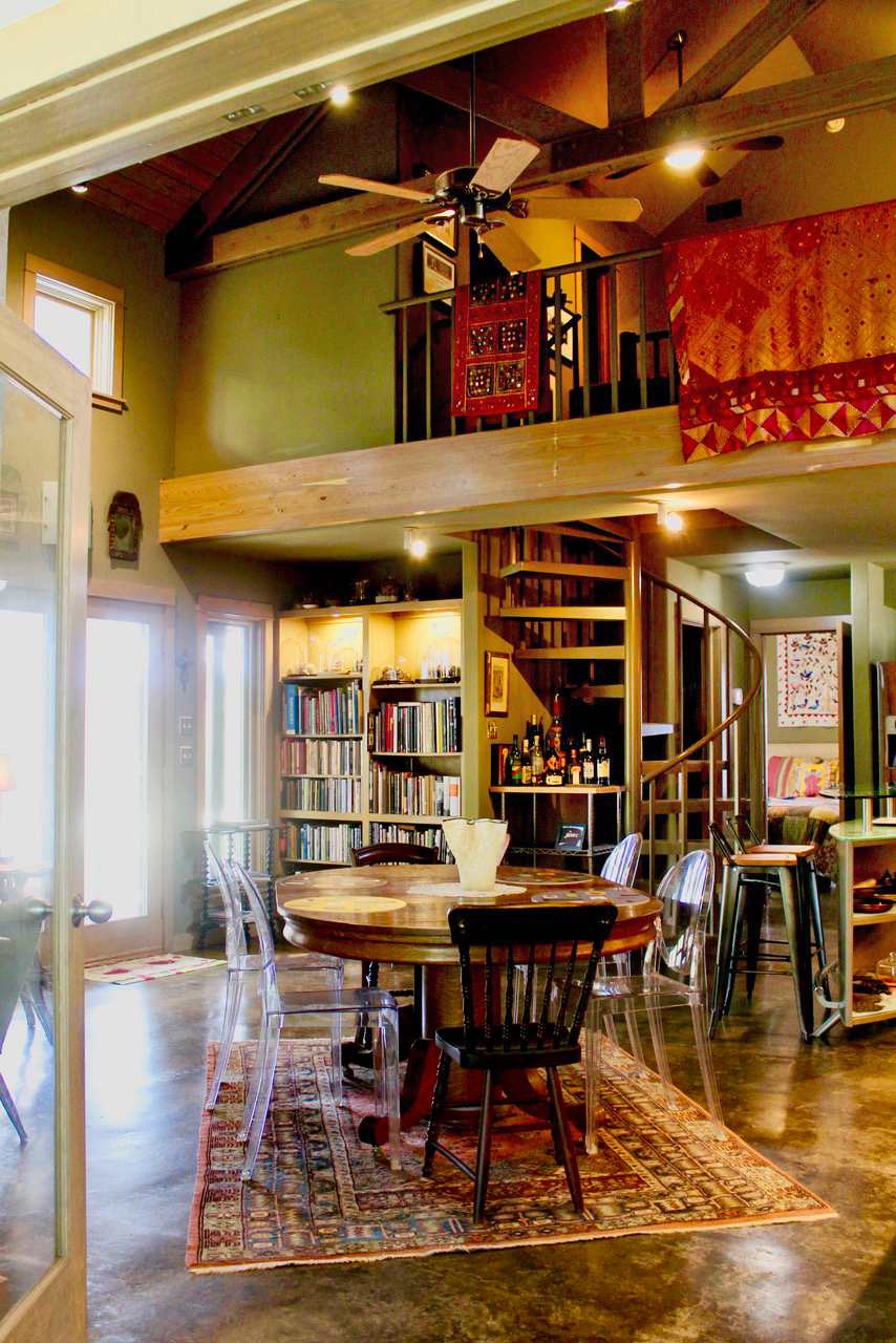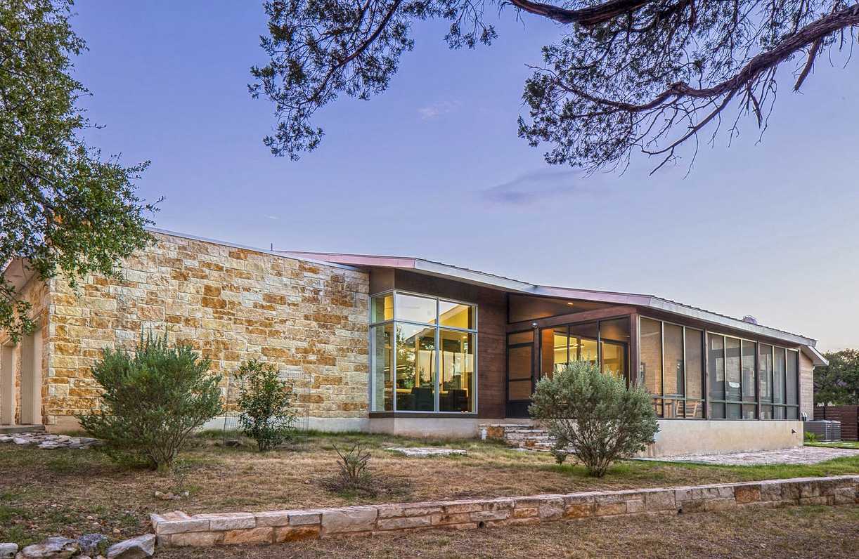 This renovated 5-acre property on the Blanco River retained the vintage exterior look with only minor changes, such as enlarging the height of the windows to better take in the sweeping views of the river. The interior was reconfigured to create a modern, open space, transforming the small house to a two bedroom, two bath home. The guesthouse has a new covered porch and stone paths to connect the spaces.