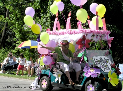 Our Wimberley Birthday Girl waves to the crowd from an outstanding parade entry.