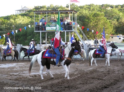 Experts on beautiful prancing pintos opening the 2004 Rodeo. www.VisitWimberley.com © 2004 All rights reserved